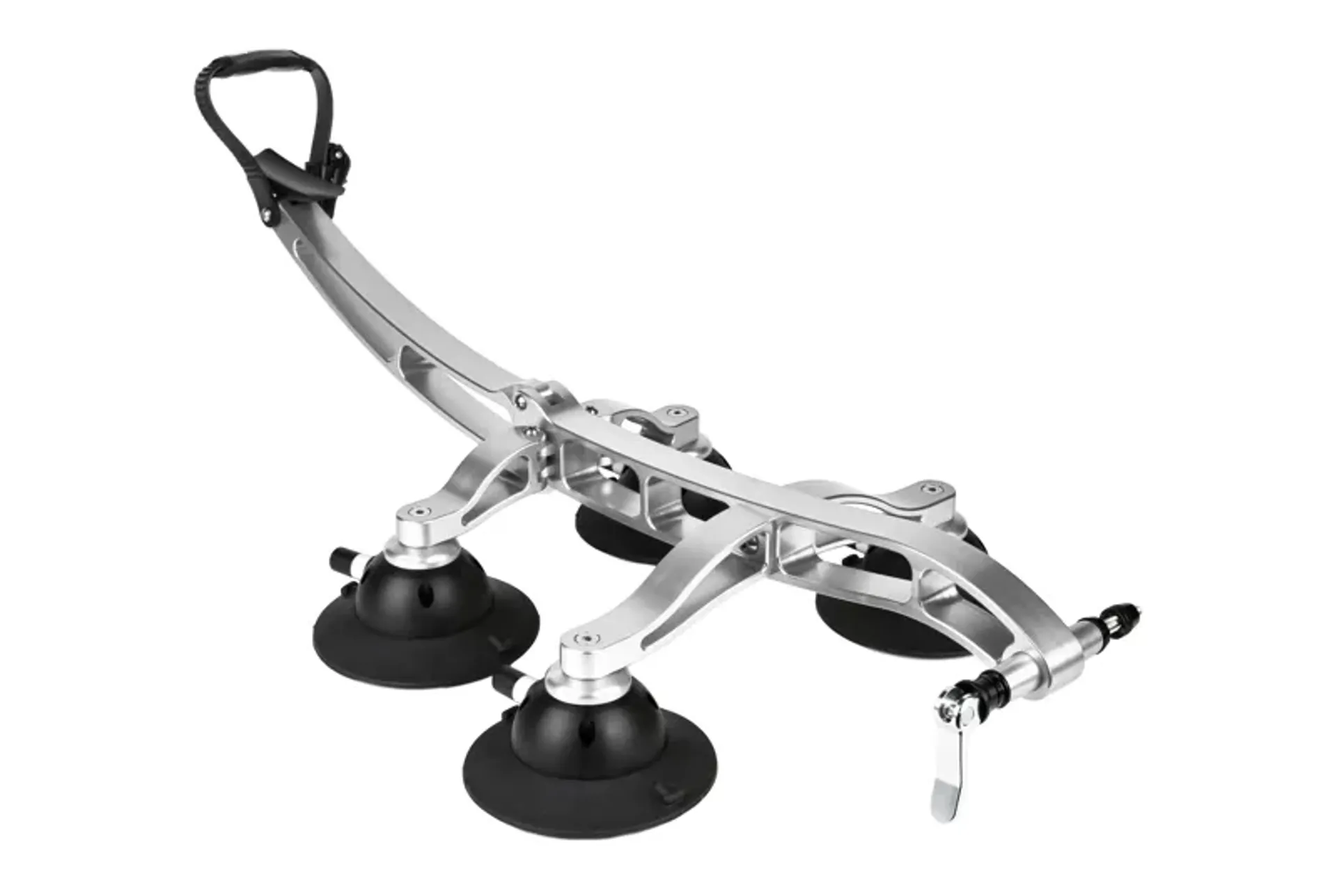 Machined from solid aluminium and available in 4 colours (Blue, Gold, Silver & black) the Komodo's tail pivots allowing it to fold up for easy storage. This bike rack is designed for road bikes or bikes with a quick release fork mount. It will not transport bikes with through axle front wheels. All four vacuum mounts articulate enabling the Komodo to conform to irregular or corrugated surfaces.